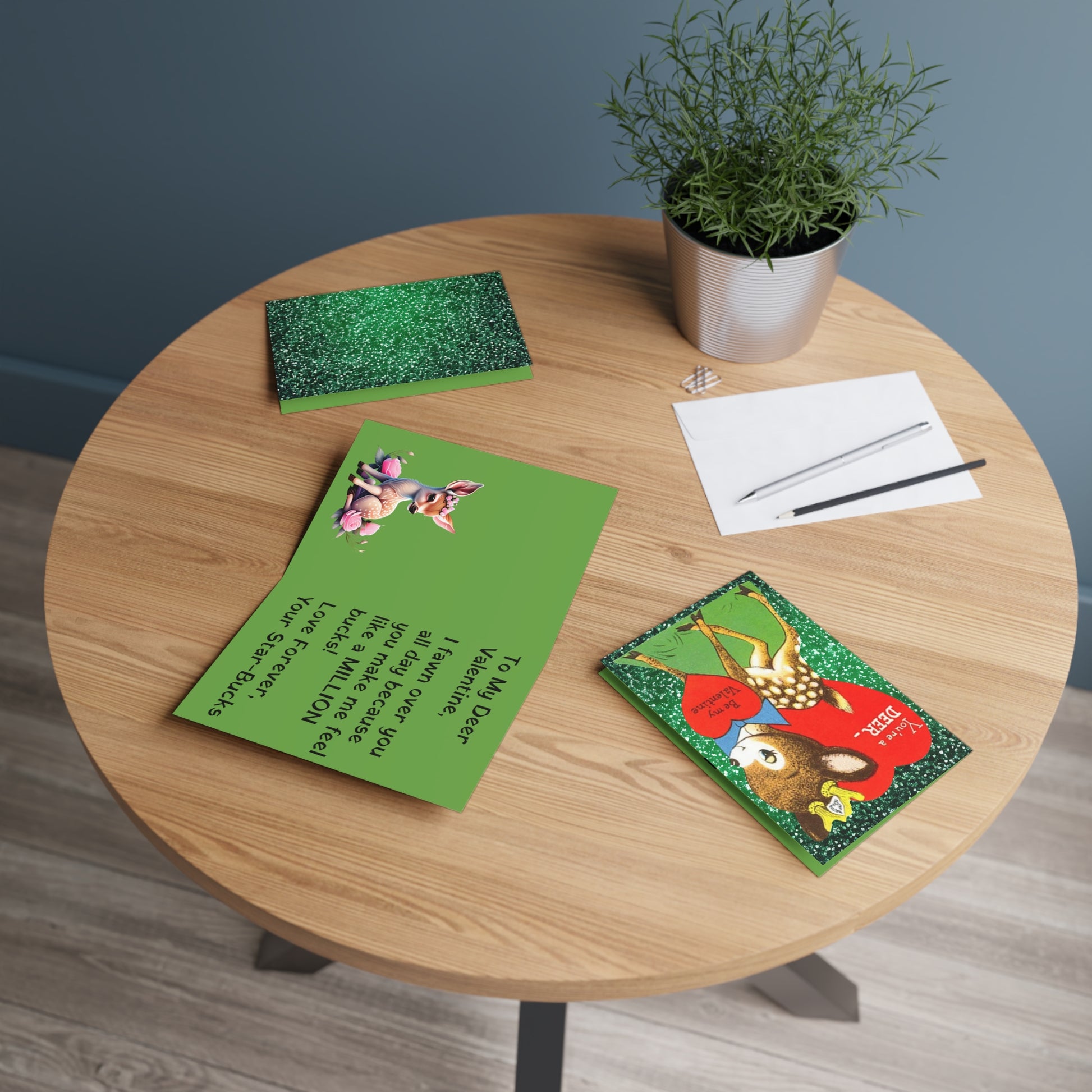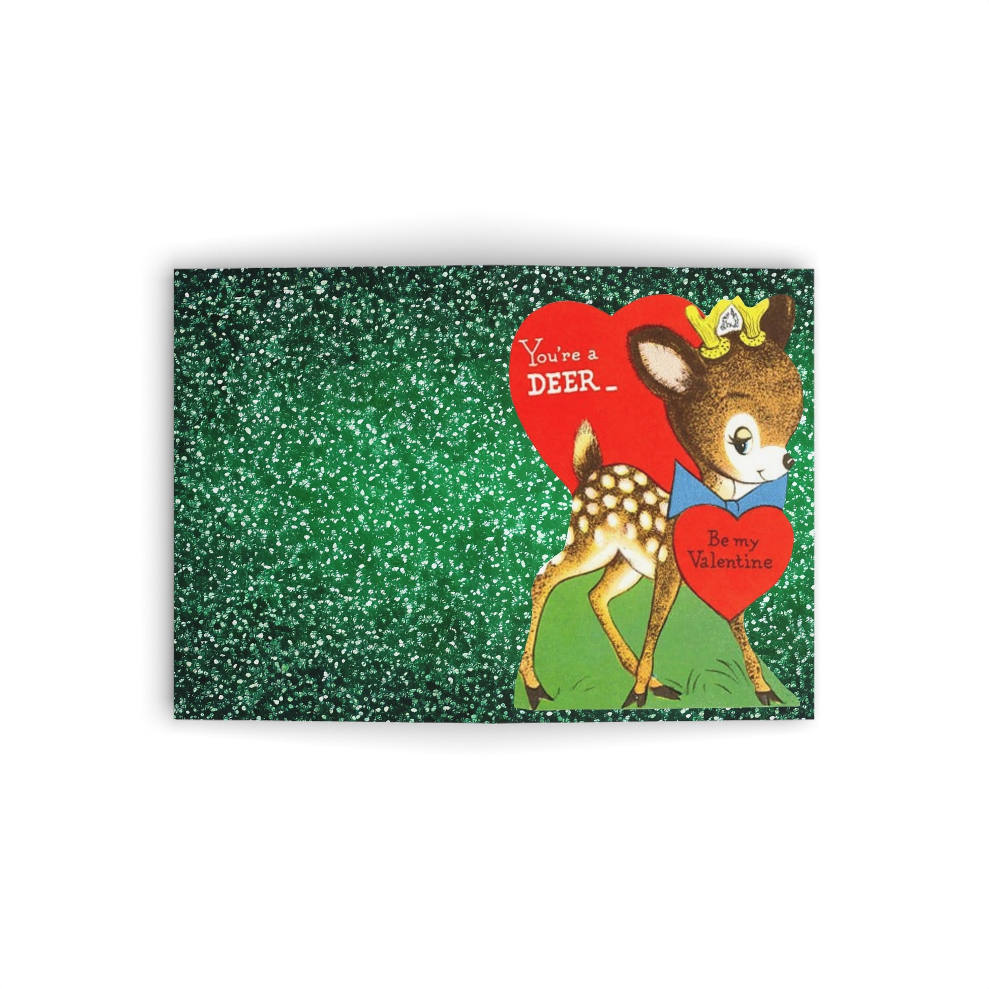 Are you a fan of the Vintage Valentine's Day look? he out says, "You're a Deer. Be my Valentine." The inside has several deer puns written in love letter fashion, "To my Deer Valentine, I fawn over you all day because you make me feel like a MILLION bucks! Love Forever, Your Star-Bucks," but there is room to write a custom message! Give the card that won't be found at the big chain. Made from premium-quality paper and printed in picture-perfect resolution, this will surely impress your special someone for Valentine's Day. Outside has a printed glitter effect without the mess.